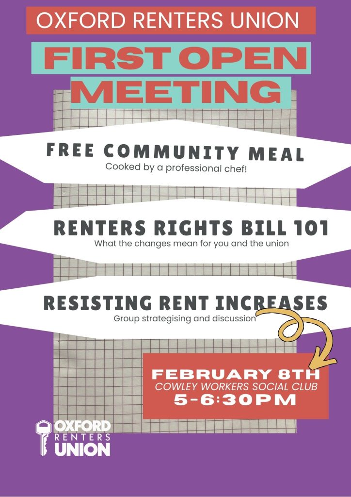 Join Oxford Renters Union for our first all-members meeting! We’ll be talking about the issues we face as renters in Oxford, about what the new Renters Rights Bill means for our fight, and about how we can use our collective power to resist rent increases. We’ll also be sharing a free community meal together!